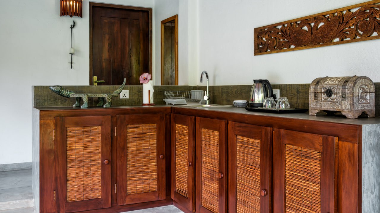 This villa is located in a beautiful tropical garden with private pool and outdoor spa bath. It is specially designed for couples who can retire in their own tropical paradise. The villa has a living area with a sofa, a spacious patio with loungers and outdoor furniture and is equipped with its own kitchen and dining room.