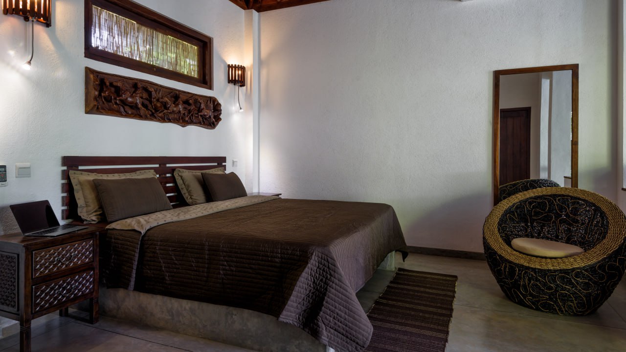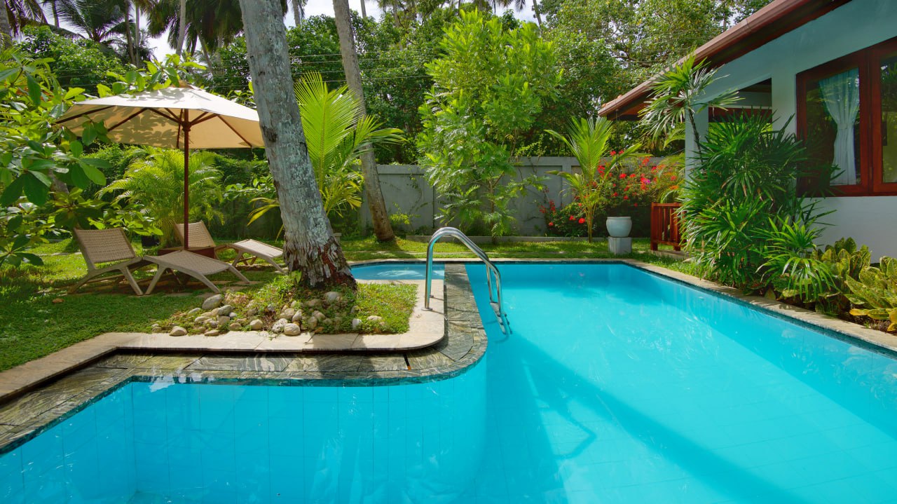 This charming villa is located in a beautiful tropical garden with private pool and outdoor spa bath. The villa has a spacious living room with a sofa, comfortable chairs, and is equipped with its own small kitchen.